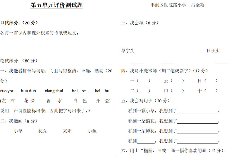 **冀教版一年级语文上册第五单元评价试题,word格式,共1页,可打印下载**