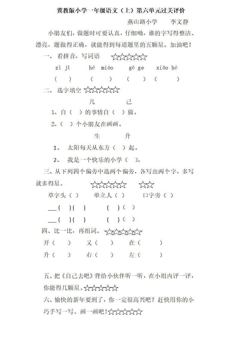 **冀教版一年级语文上册第六单元评价试题,word格式,共2页,可打印下载**