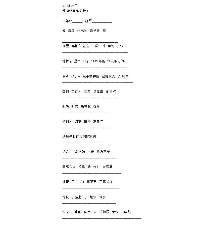 **一年级复习资料 乱词组句练习卷,word格式,共2页,可打印下载**