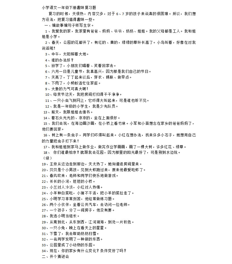 **小学语文一年级下册趣味复习题1,word格式,共5页,可打印下载**