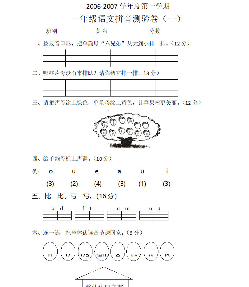**小学一年级语文上册第一学期拼音测验卷,word格式,共3页,可打印下载**