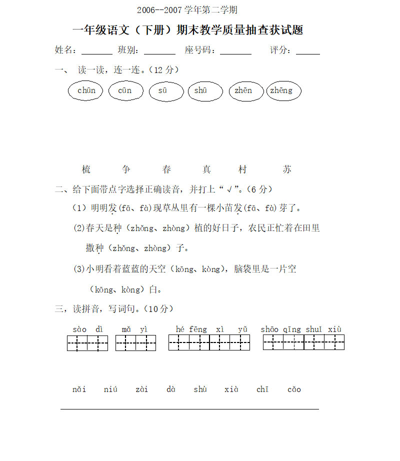 小学一年级语文下册质量抽查获试题