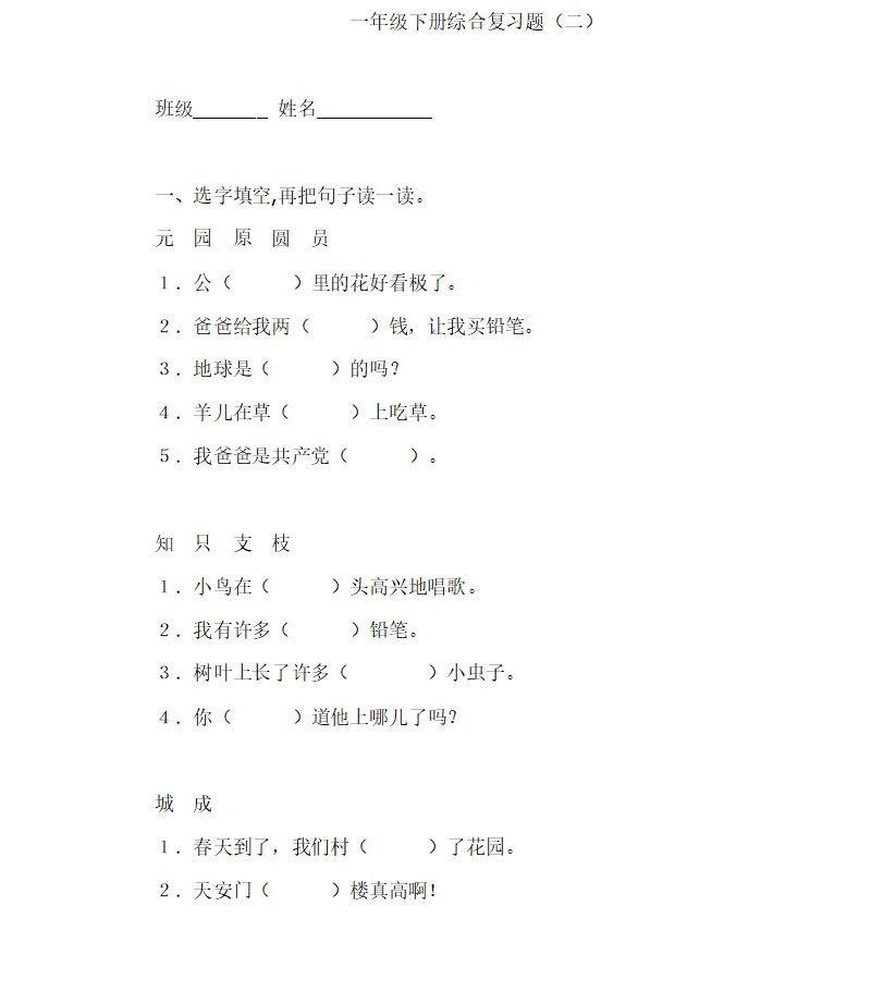 **小学一年级语文下册综合复习题(二),word格式,共5页,可打印下载**