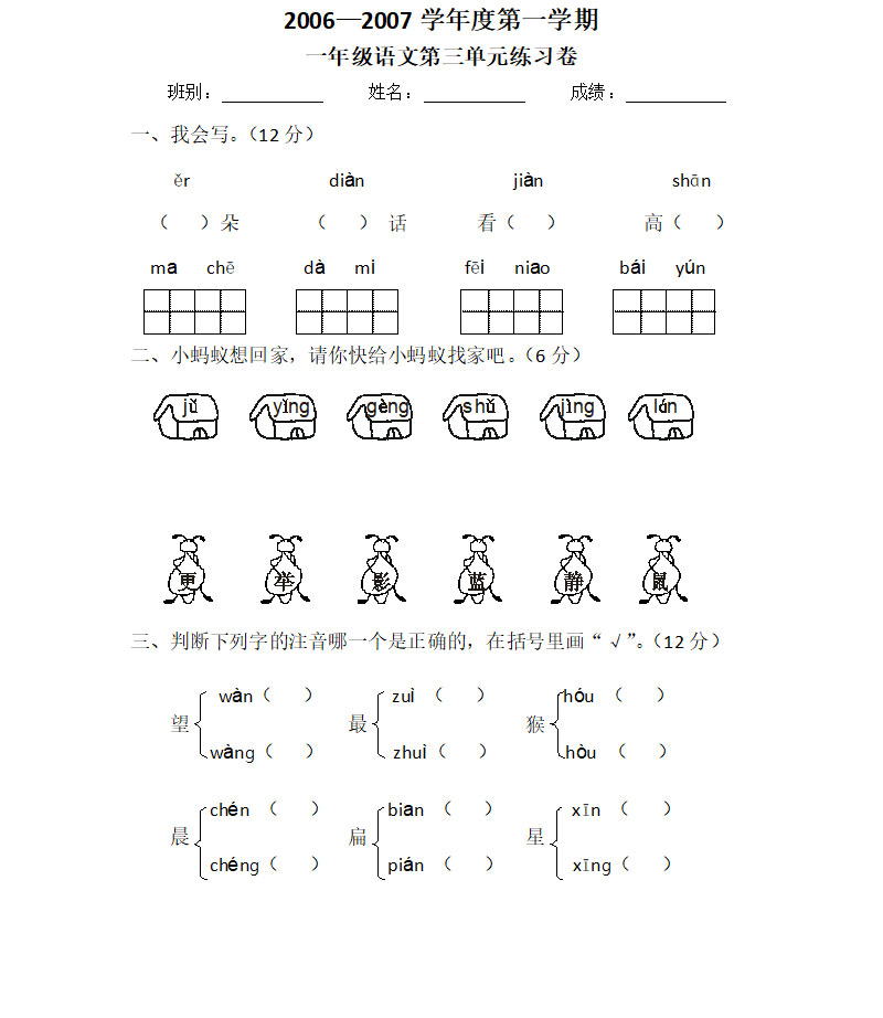 一年级语文第一学期第三单元测验卷