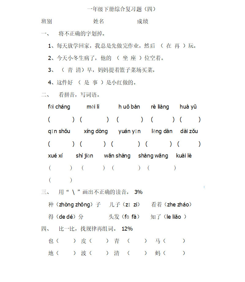 **一年级语文下册综合复习题(四),word格式,共2页,可打印下载**