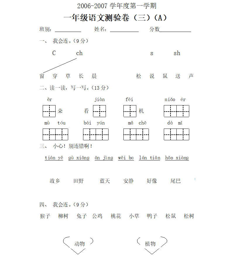 **一年级语文第一学期测验卷,word格式,共3页,可打印下载**