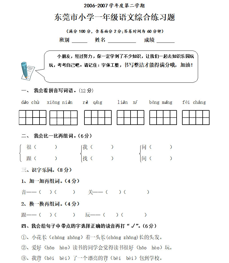**人教版新课标小学一年级语文下册综合练习题,word格式,共4页,可打印下载**