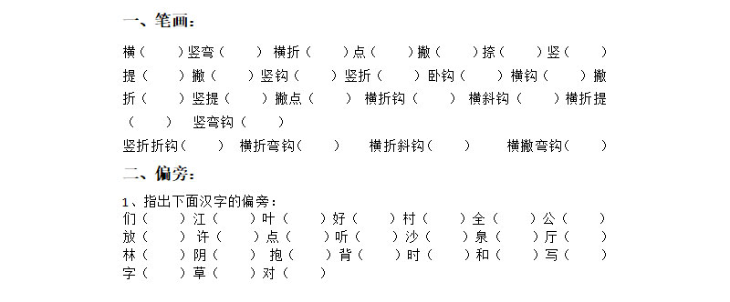 **苏教版小学一年级语文上册笔画、偏旁练习题,word格式,共1页,可打印下载**