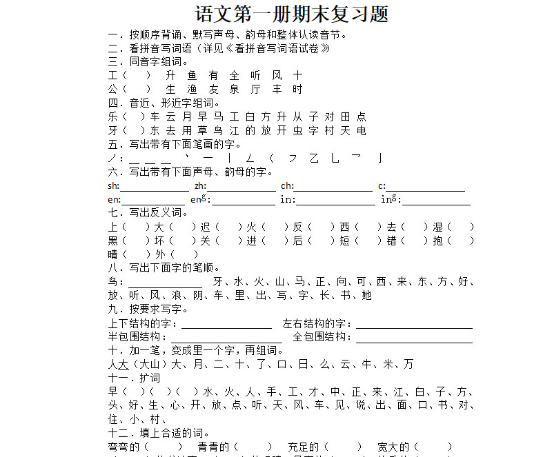 **苏教版小学一年级语文第一册期末复习题,word格式,共3页,可打印下载**