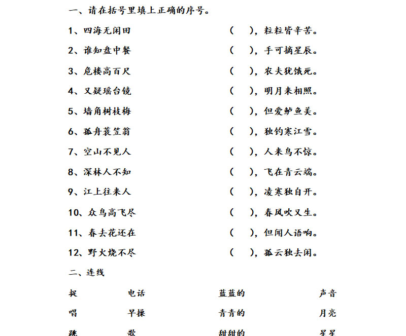 **古诗上下句练习题,word格式,共2页,可打印下载**