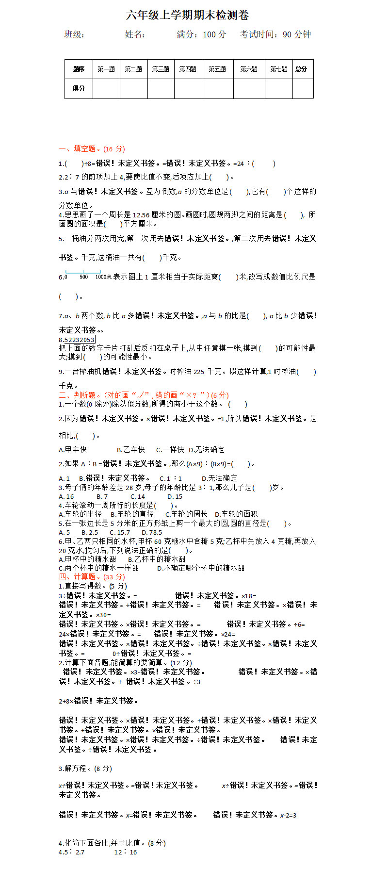 **2021年西师大版六年级数学上册期末测试题及答案,word格式,共3页,可打印下载**
