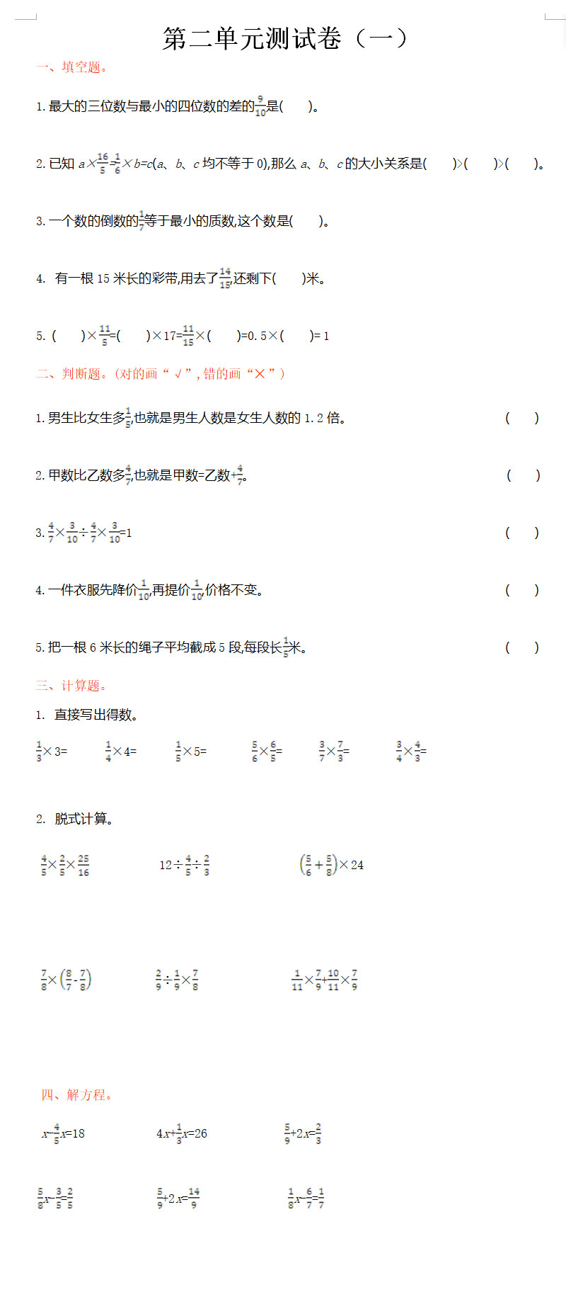 **2021年北师大版六年级数学上册第二单元测试题及答案A,word格式,共4页,可打印下载**