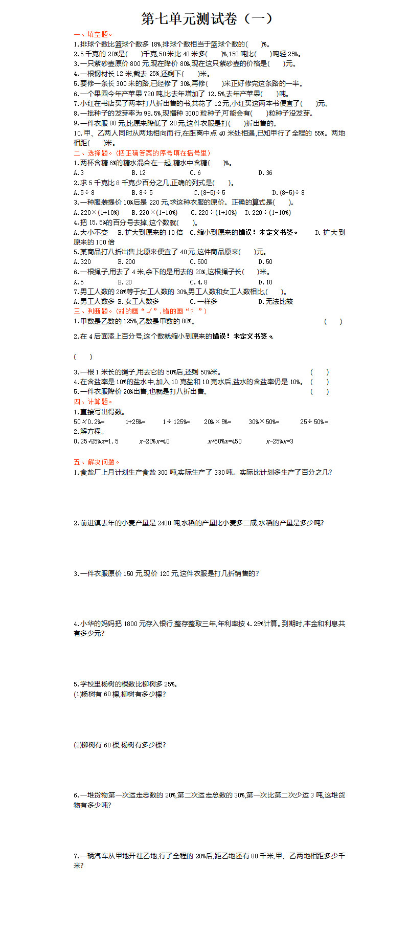 **2021年北师大版六年级数学上册第七单元测试题及答案一,word格式,共3页,可打印下载**