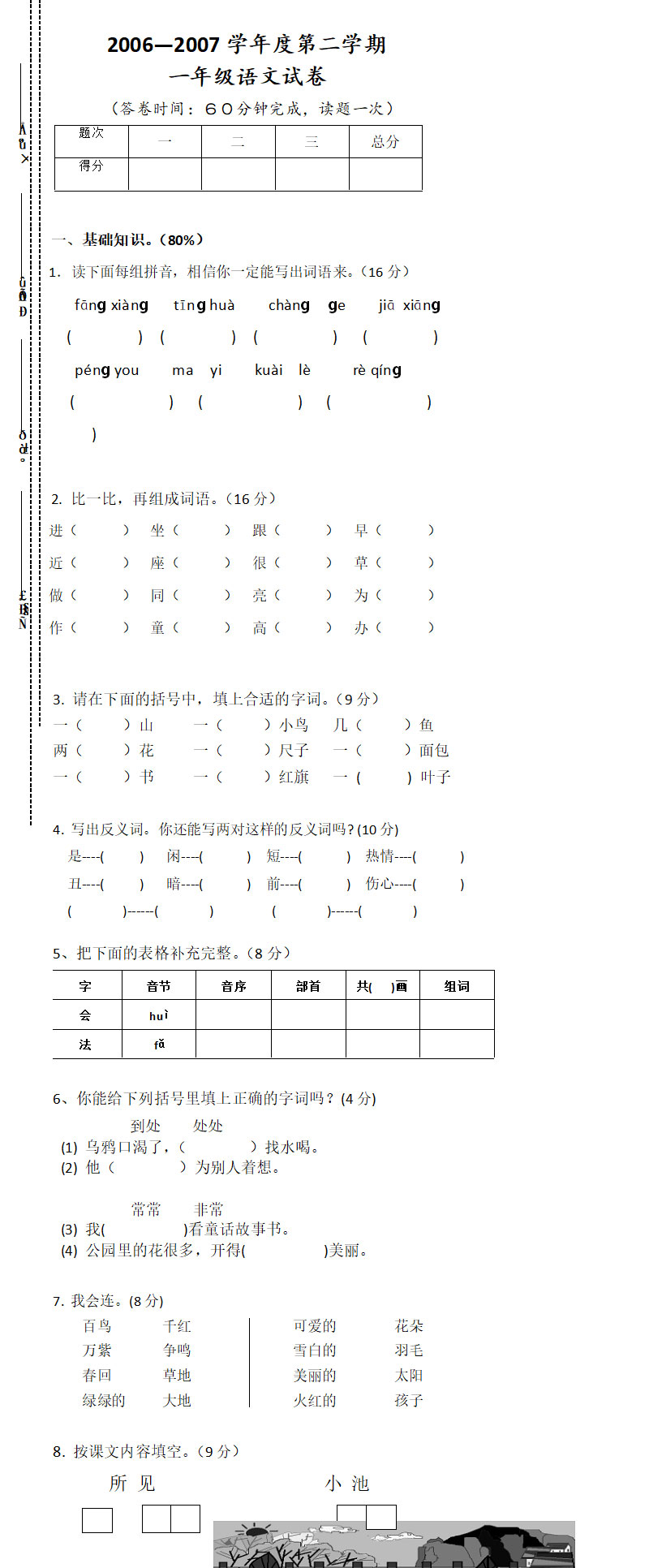 2006-2007年人教版新课标小学一年级语文第二学期期末试卷