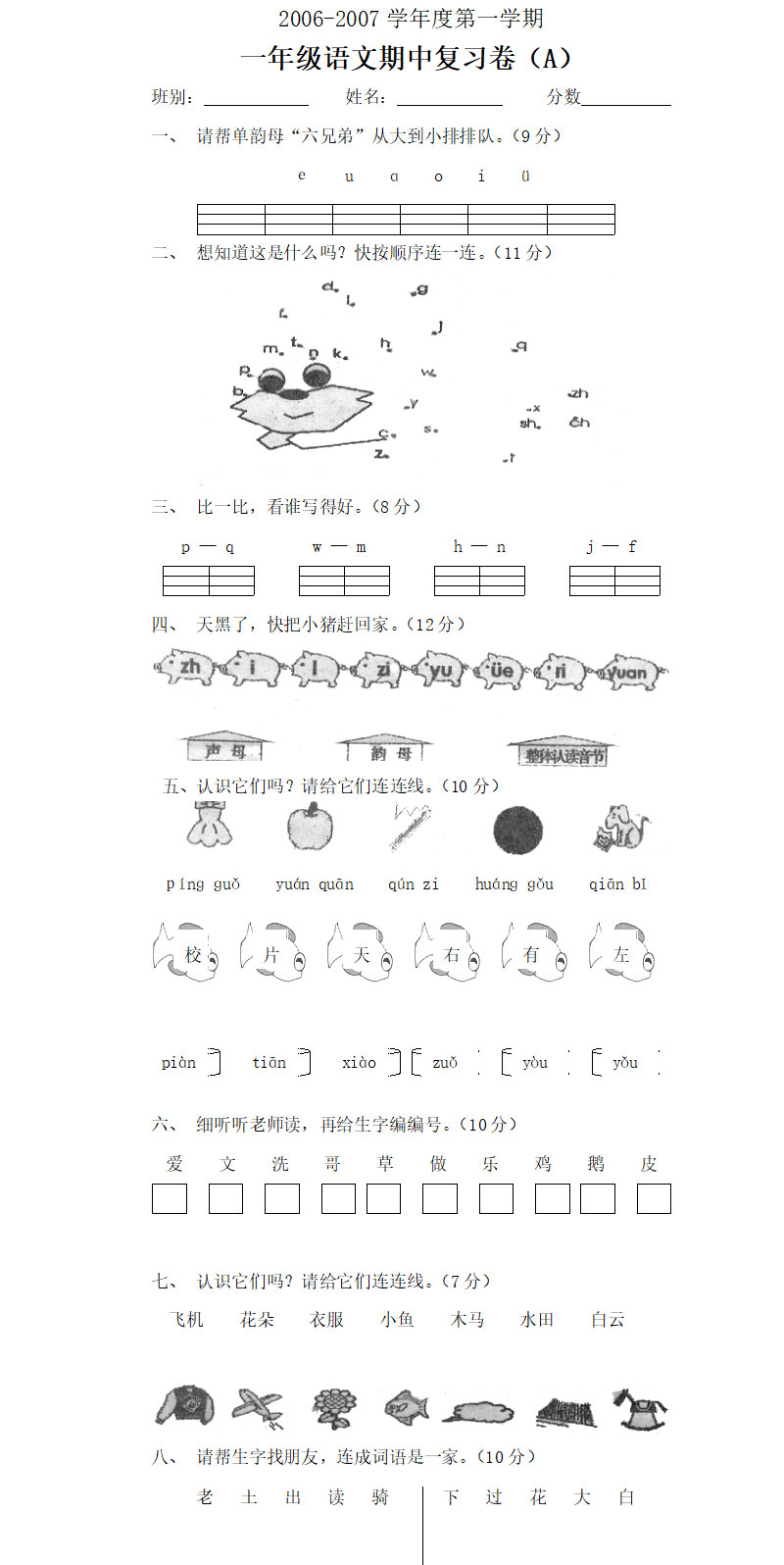 人教版新课标小学一年级语文第一学期期中复习试卷(A)