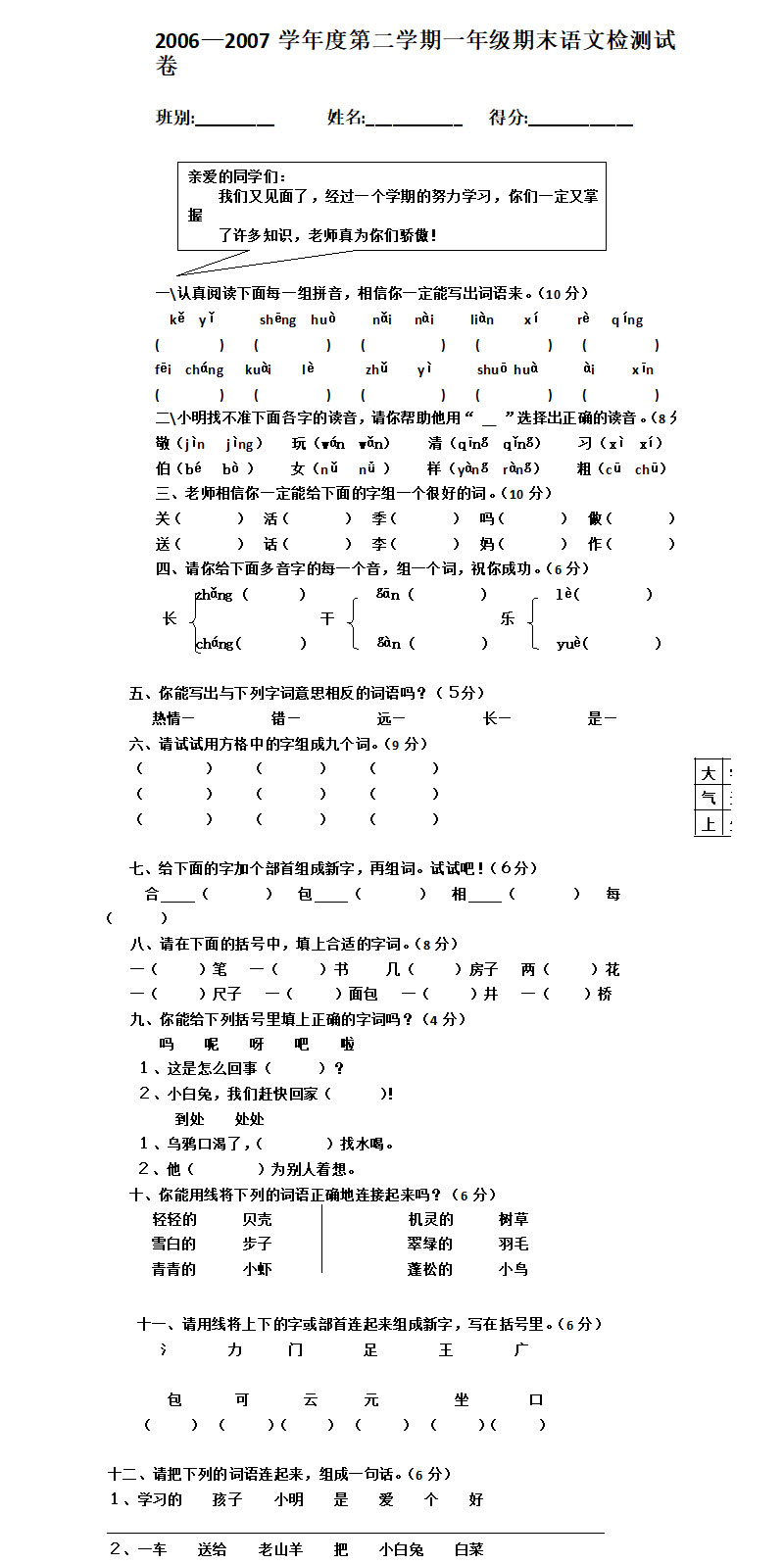 **人教版新课标小学一年级语文下册测试题,word格式,共2页,可打印下载**