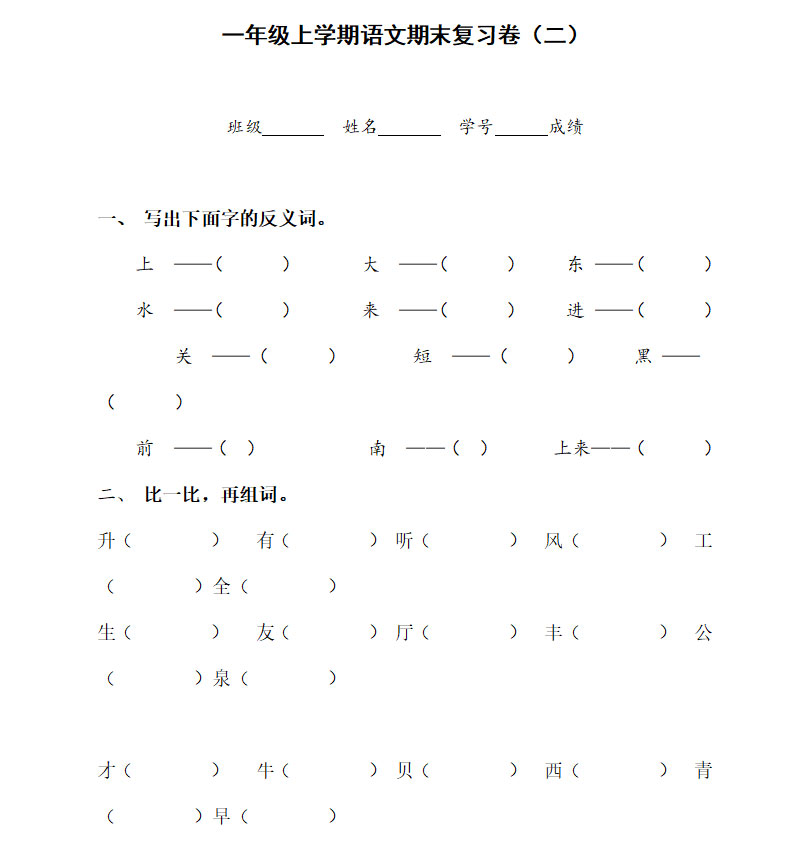 **苏教版小学一年级上学期语文期末复习卷(二),word格式,共1页,可打印下载**