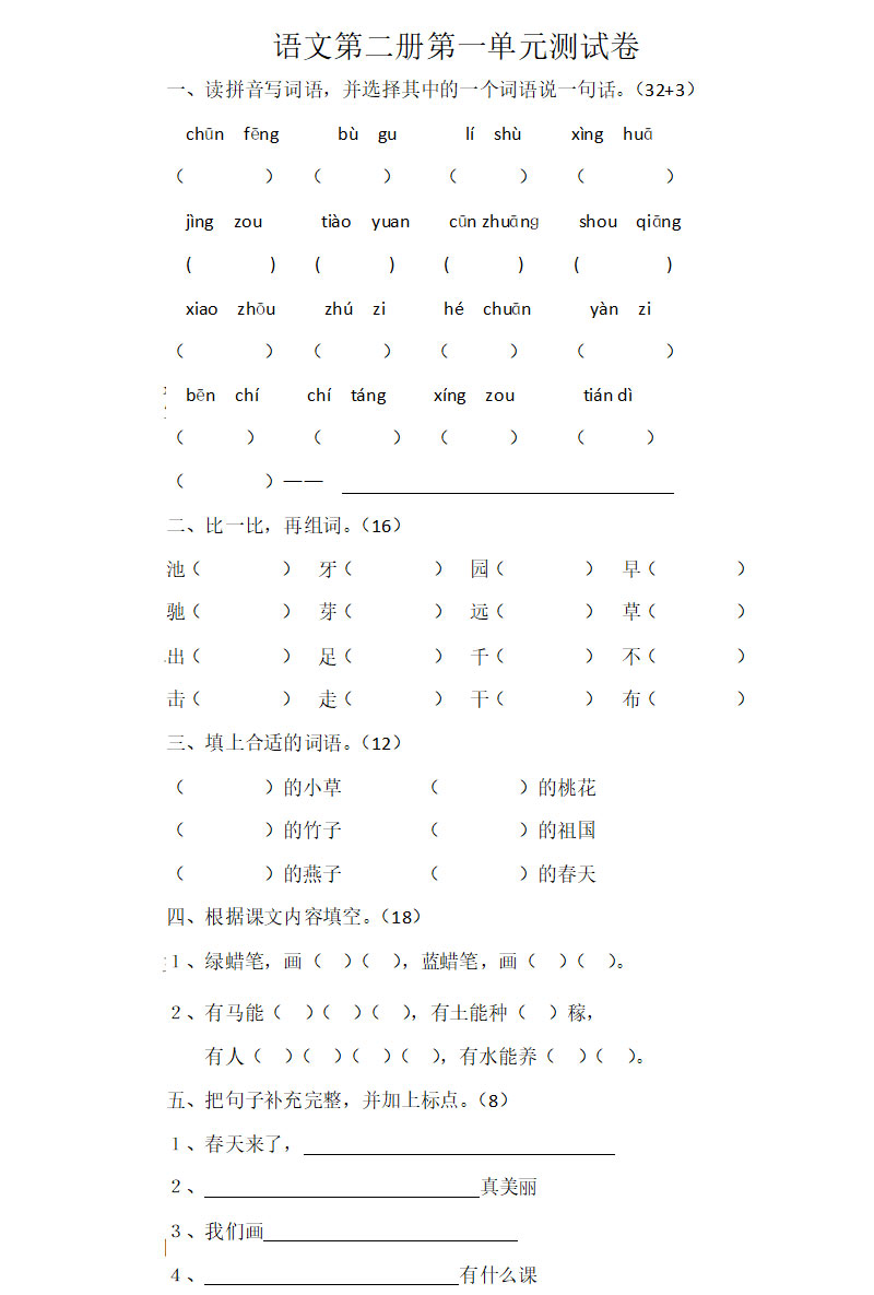 **小学一年级语文第二册第一单元测试题,word格式,共3页,可打印下载**