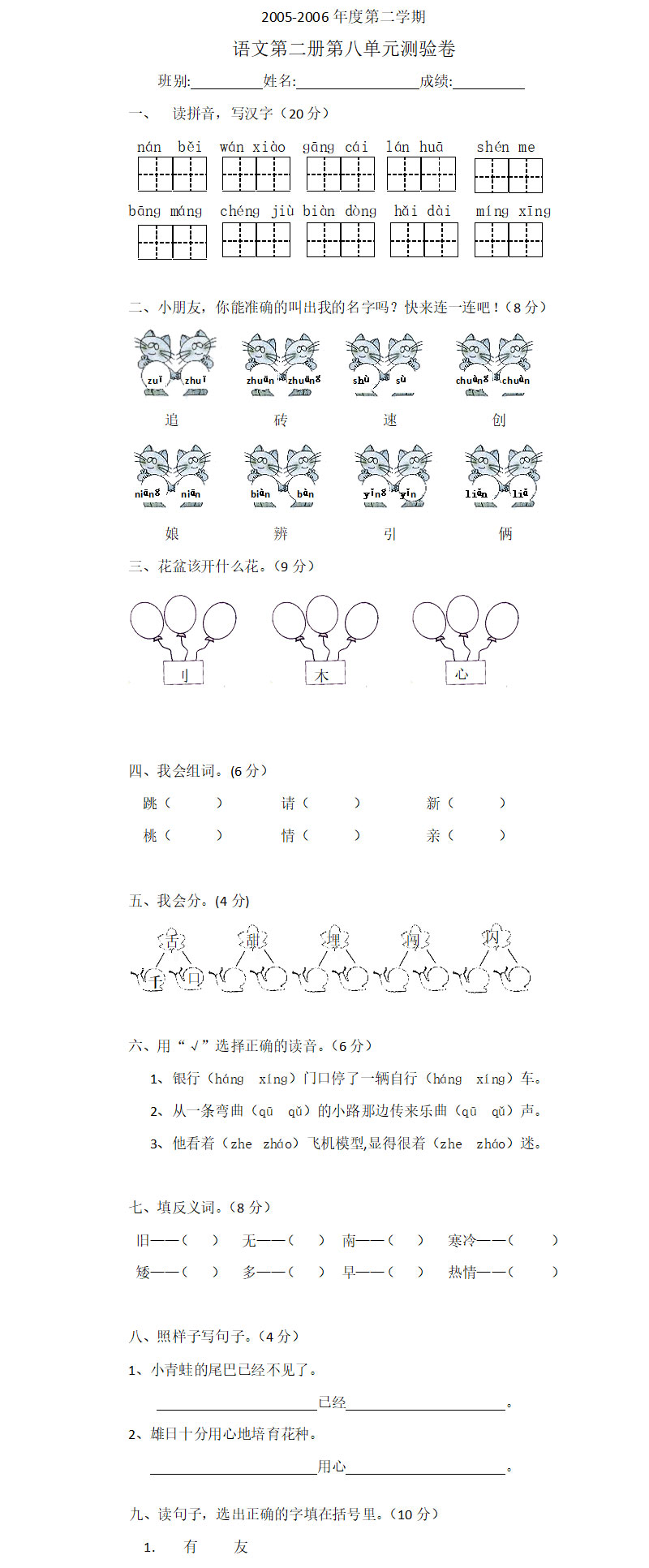 **小学一年级语文第二册第八单元测验卷测试题,word格式,共4页,可打印下载**