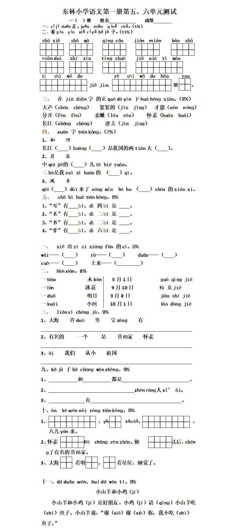 **小学一年级语文第一册第5.6单元测试题,word格式,共3页,可打印下载**
