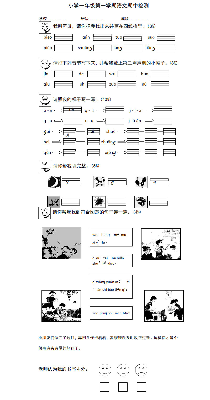 **小学一年级语文第一学期期中检测题,word格式,共2页,可打印下载**