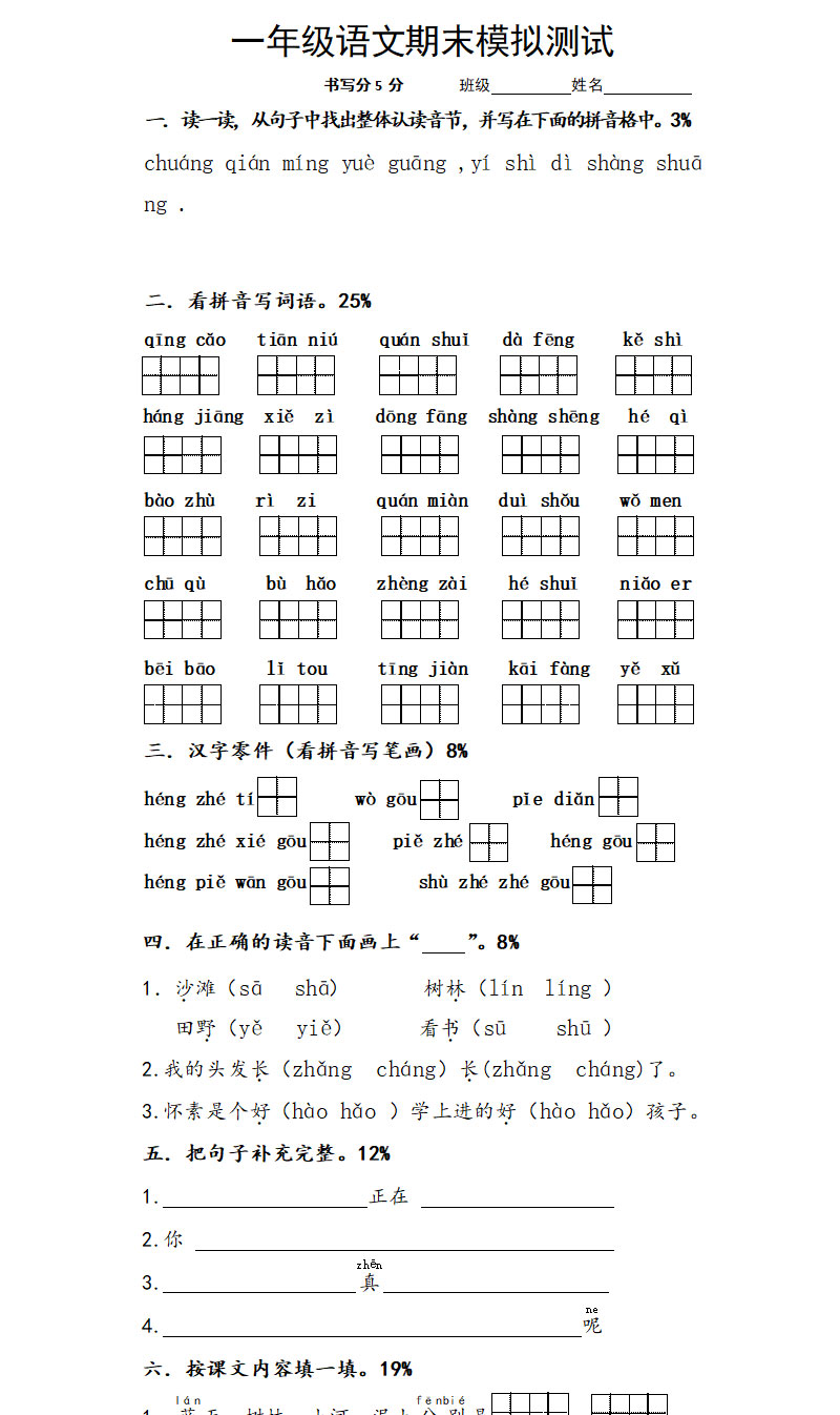 **小学一年级语文期末模拟测试,word格式,共4页,可打印下载**