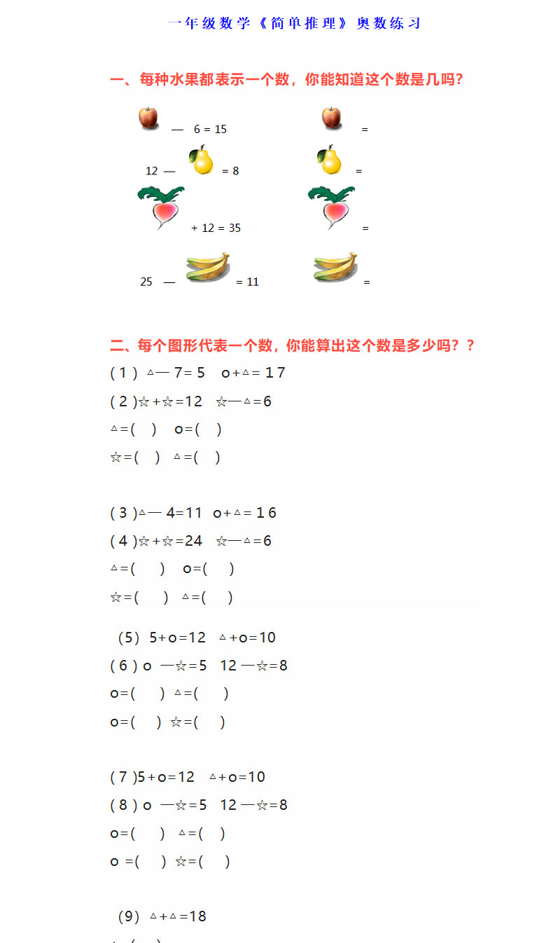 **一年级数学《简单推理》奥数练习,word格式,共6页,可打印下载**