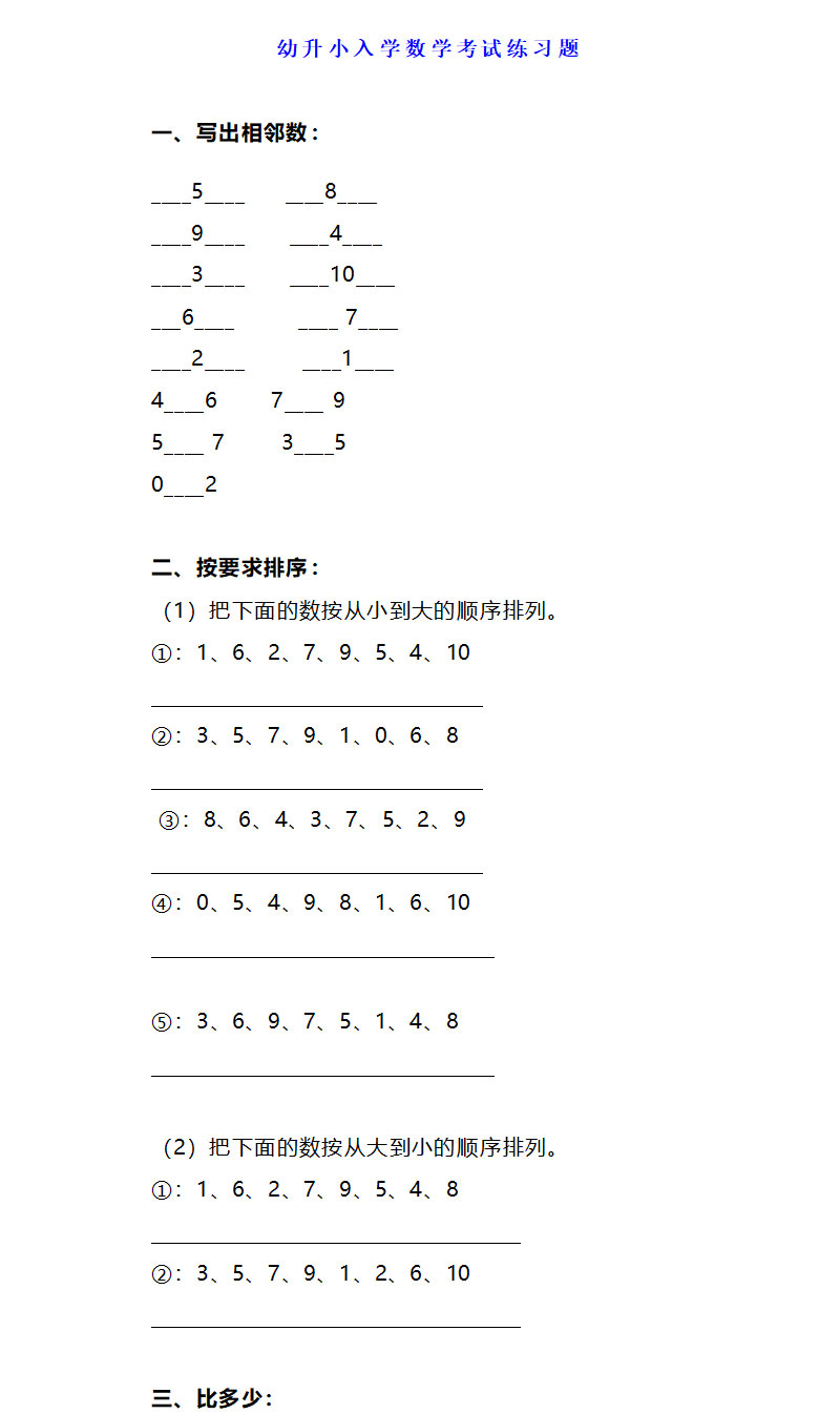 **幼升小入学数学考试练习题,word格式,共7页,可打印下载**