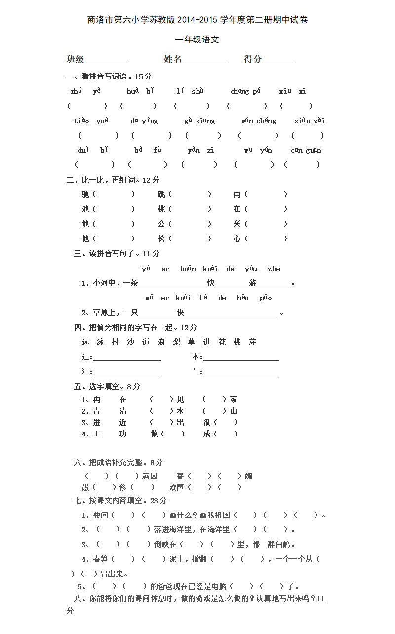 **商洛市第六小学一年级语文下册期中试卷,共2页,可打印下载**
