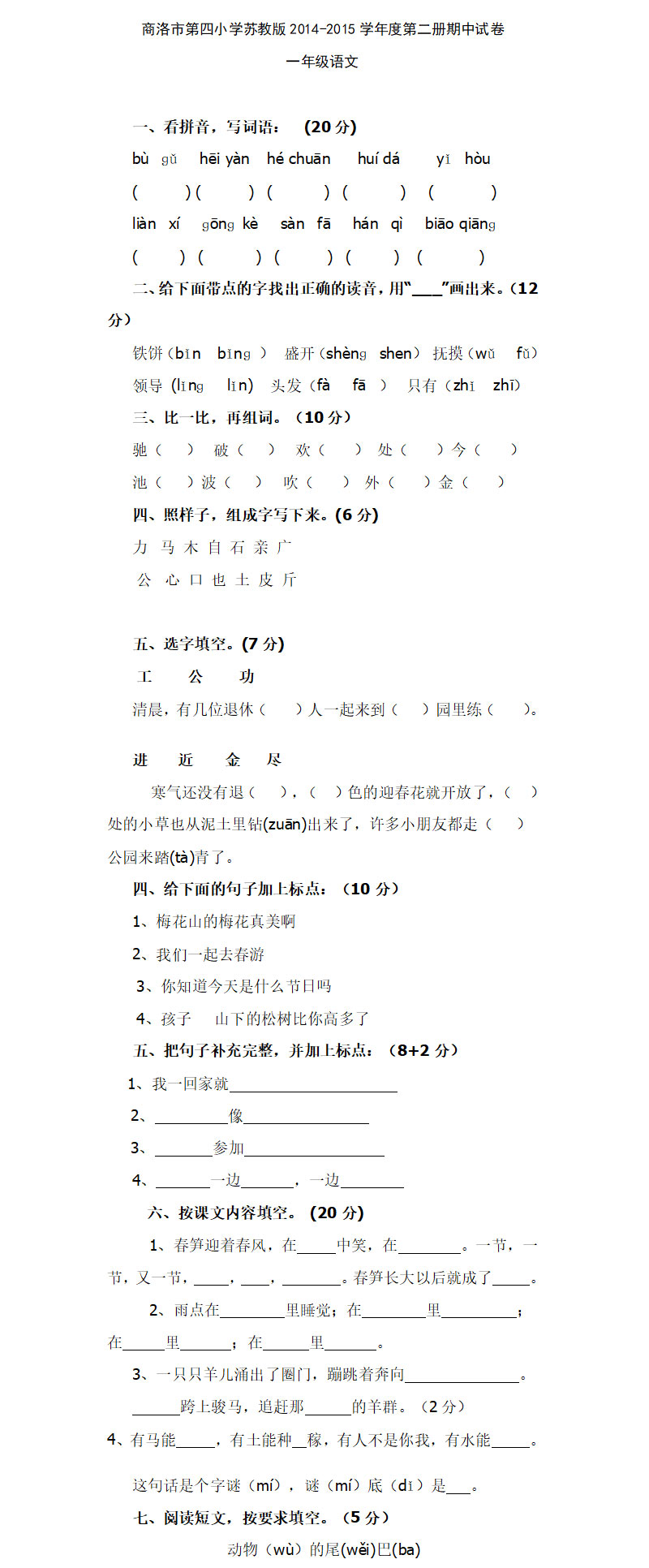 **商洛市第四小学一年级语文下册期中试卷,word格式,共3页,可打印下载**