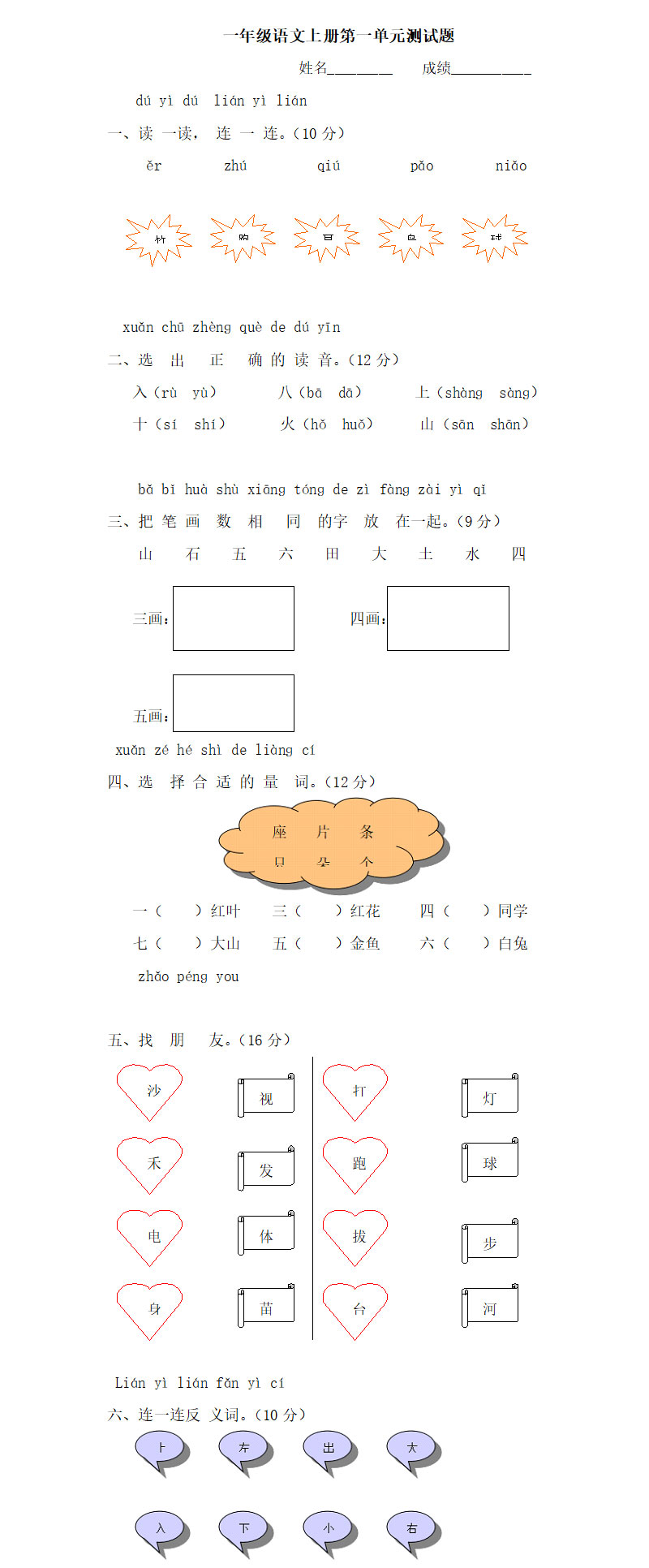 小学一年级语文上册第一单元测试题及答案(A卷)