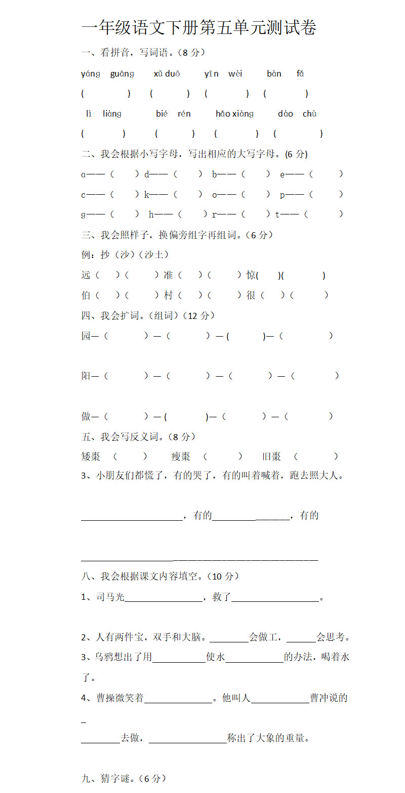 **一年级语文下册第五单元试卷,word格式,共3页,可打印下载**