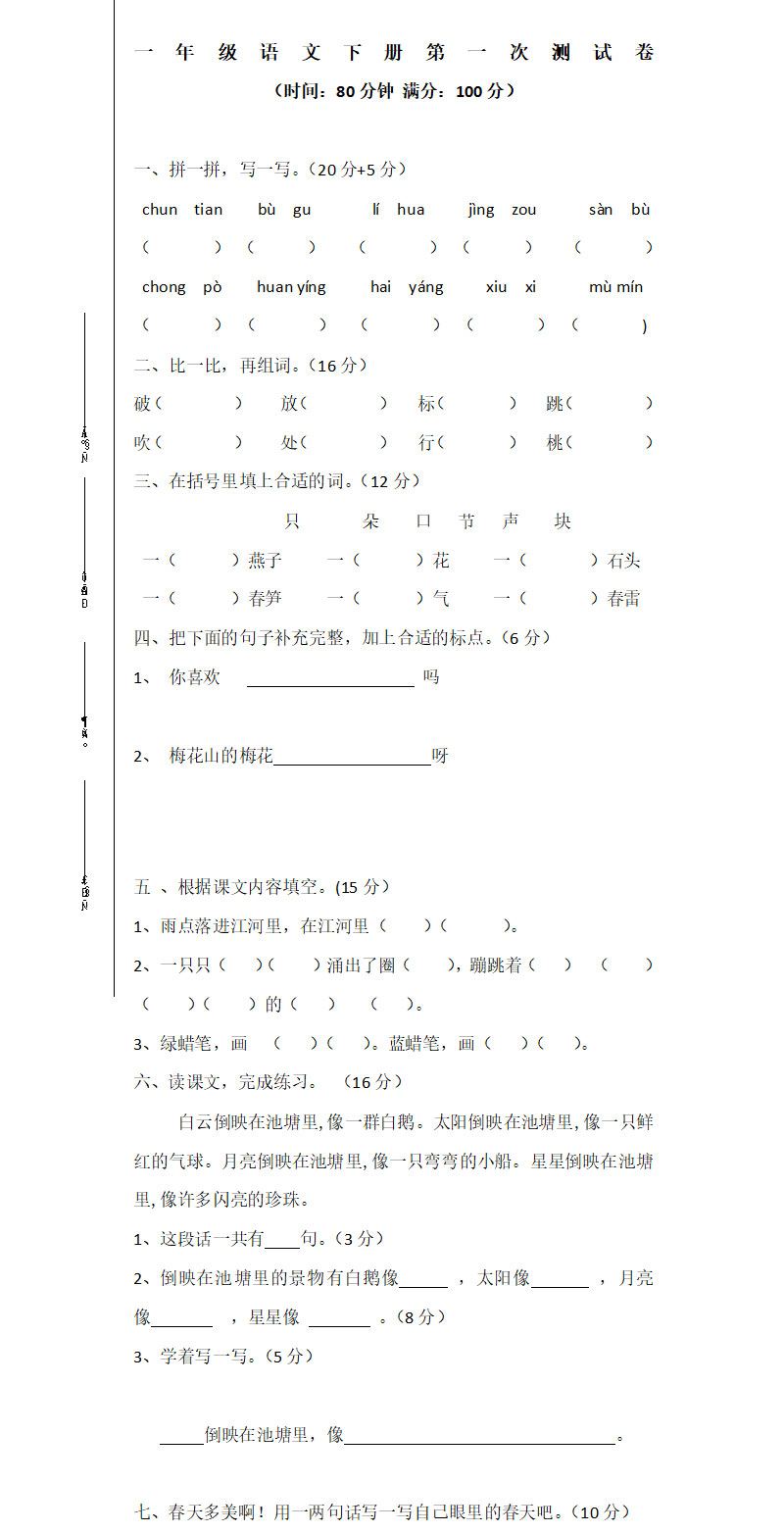 **一年级语文下册第一次月考题第五周,word格式,共3页,可打印下载**