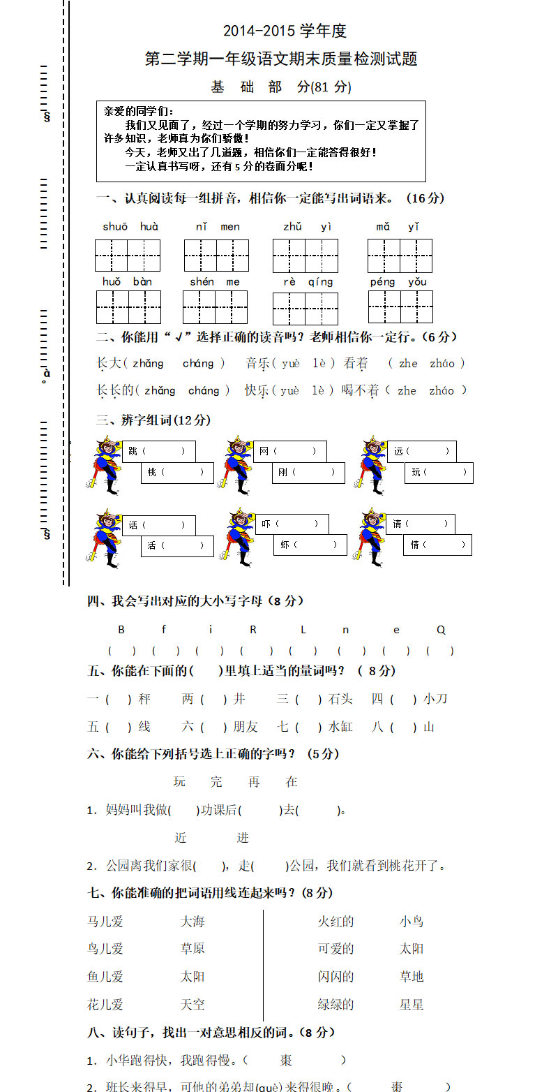 **一年级语文下册期末试卷,word格式,共3页,可打印下载**
