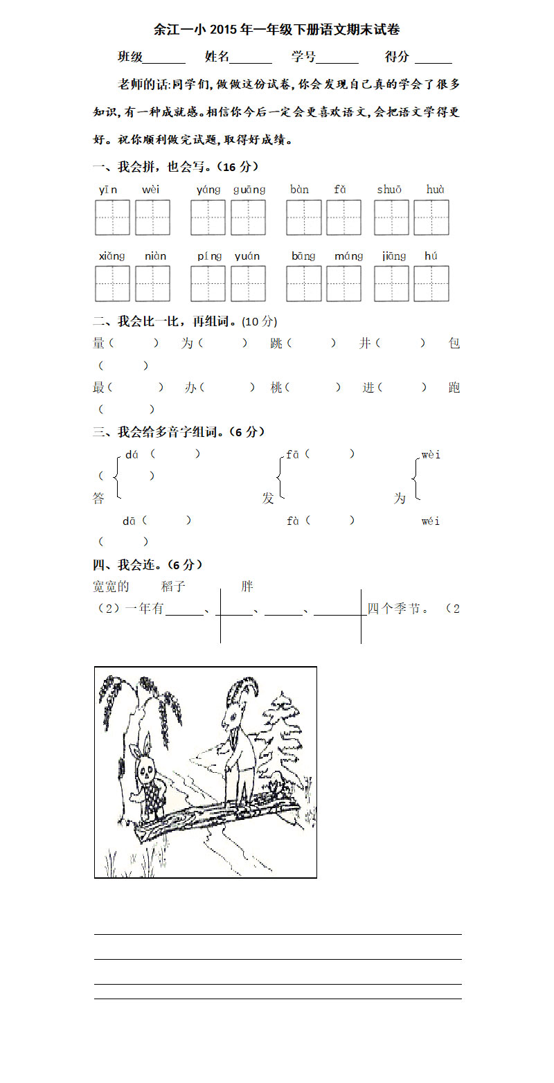 **余江一小一年级下册语文期末试卷,word格式,共2页,可打印下载**