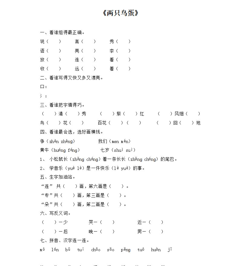 **一年级语文下册《两只鸟蛋》练习题,word格式,共2页,可打印下载**
