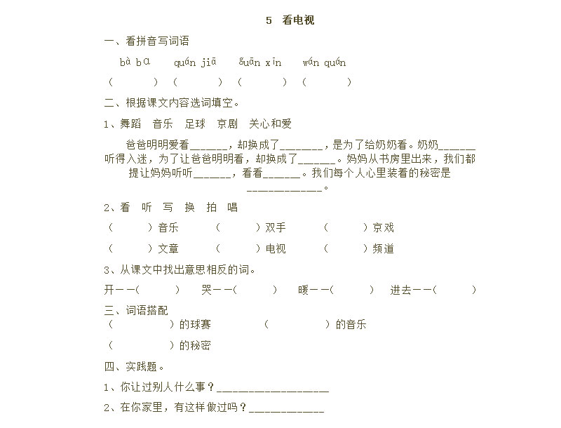 **一年级语文下册看电视练习题,word格式,共1页,可打印下载**