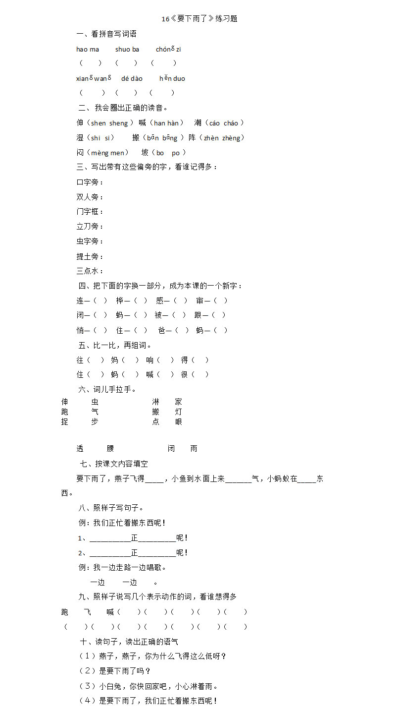 **一年级语文下册要下雨了练习题,word格式,共2页,可打印下载**