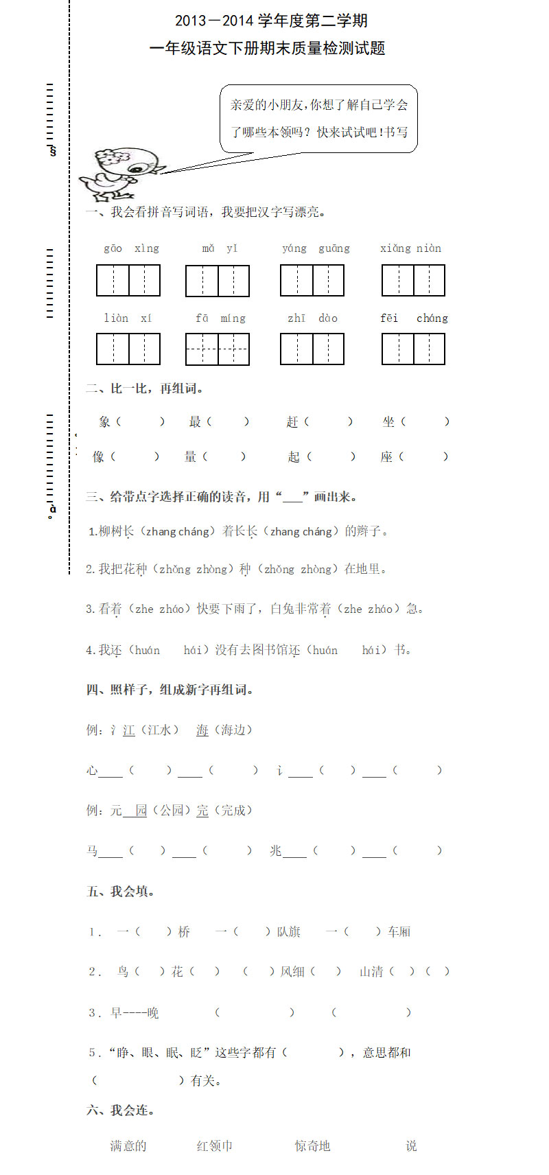 **邹城市第二实验小学第二学期一年级语文期末测试,word格式,共3页,可打印下载**