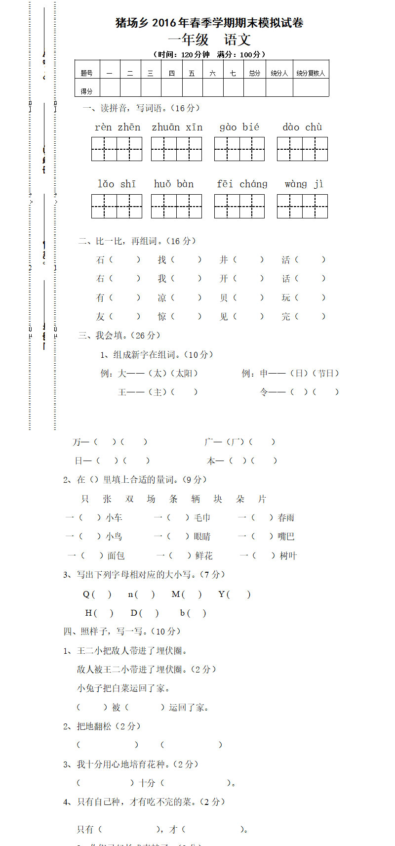 猪场乡2016年春季学期一年级语文期末模拟试卷