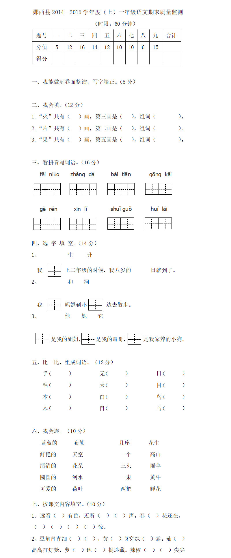 **郧西县(上)一年级语文期末质量监测卷,word格式,共5页,可打印下载**