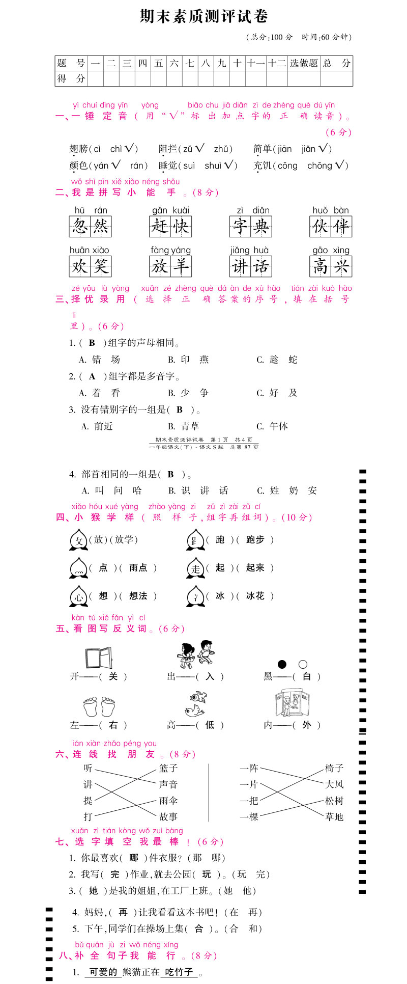 **语文S版一年级下册期末测试卷含答案,pdf格式,共4页,可打印下载**