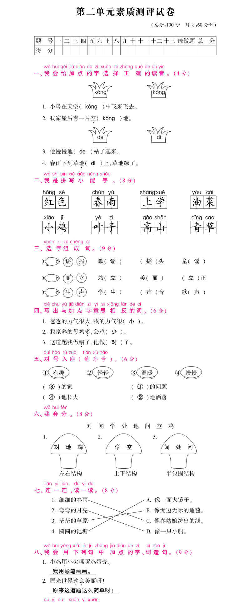 **语文S版一年级下册第二单元测试卷含答案,pdf格式,共4页,可打印下载**