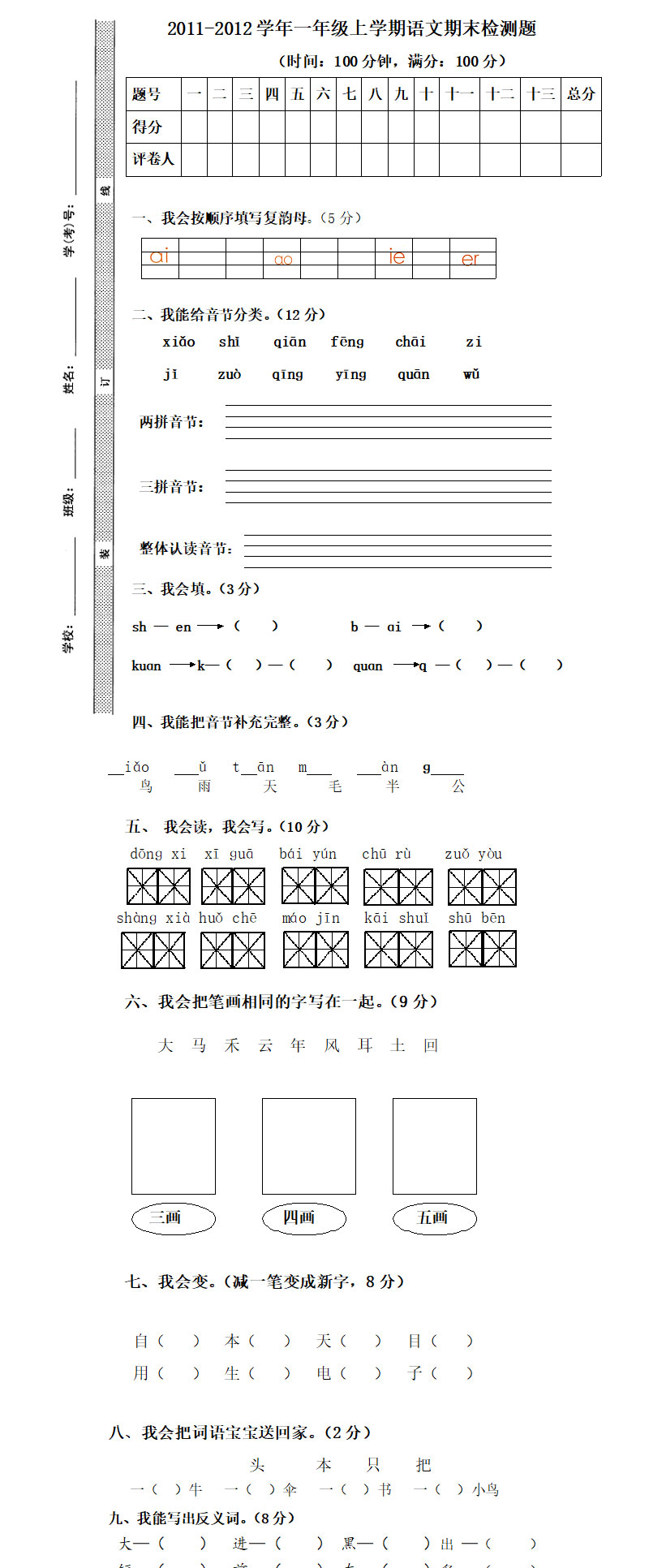语文S版一年级上学期语文期末试卷