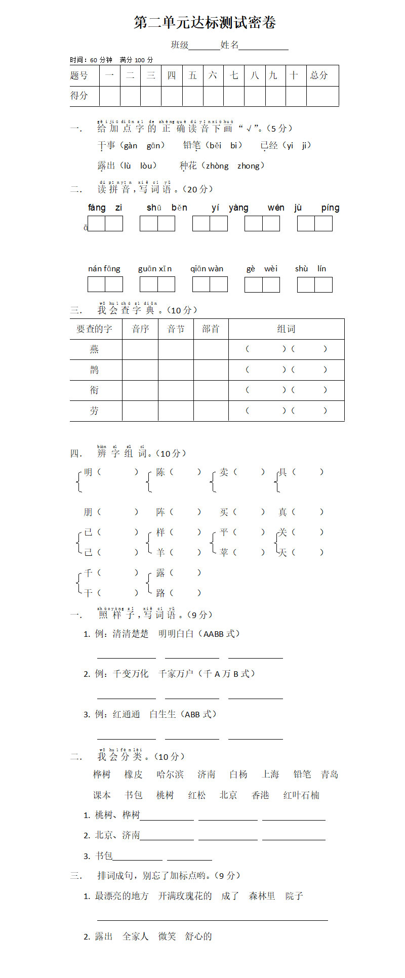 **语文A版一年级下册第二单元测试题,word格式,共4页,可打印下载**
