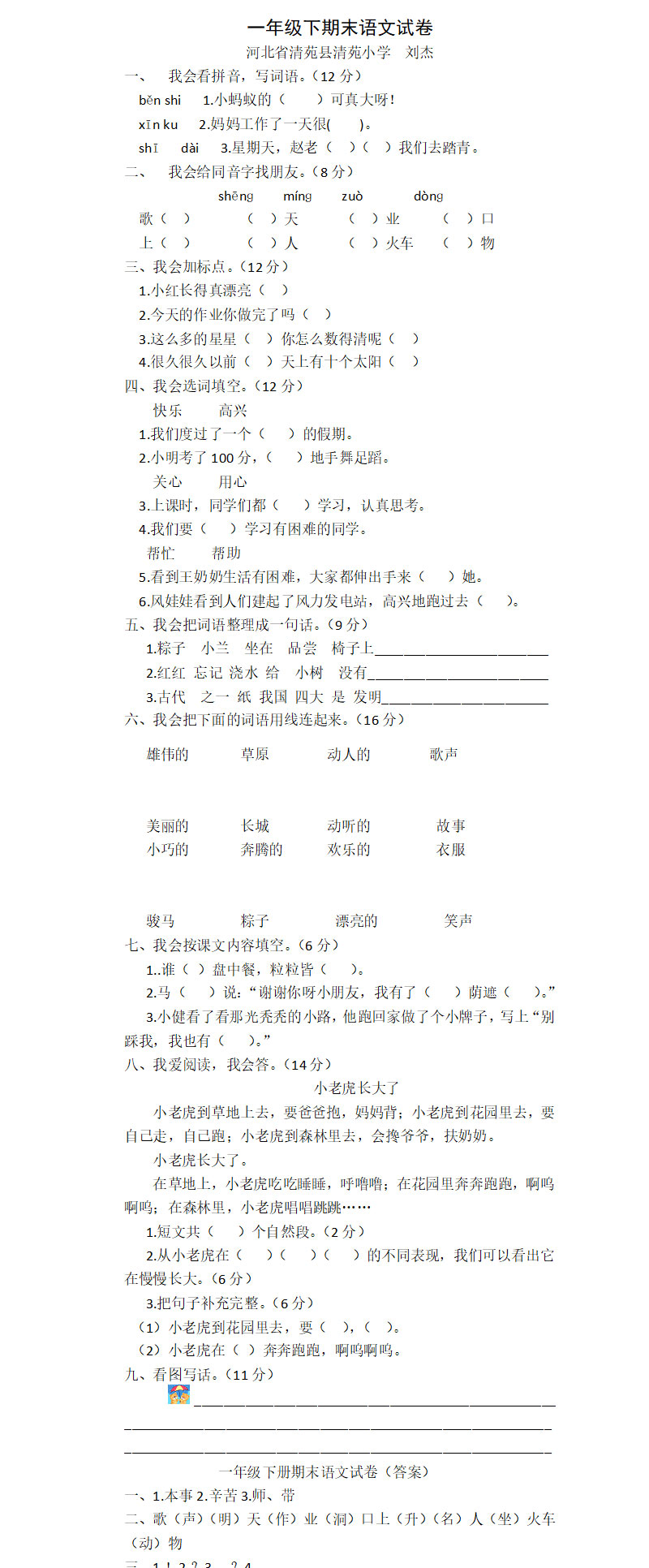 **语文A版小学一年级下册期末试卷及答案,word格式,共3页,可打印下载**