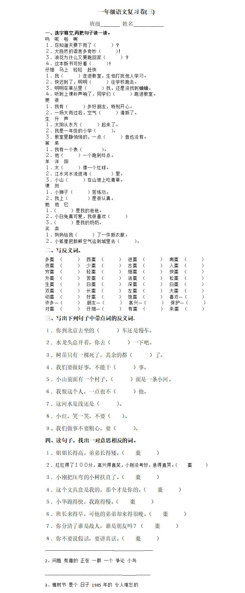 **一年级下册语文复习卷,word格式,共5页,可打印下载**
