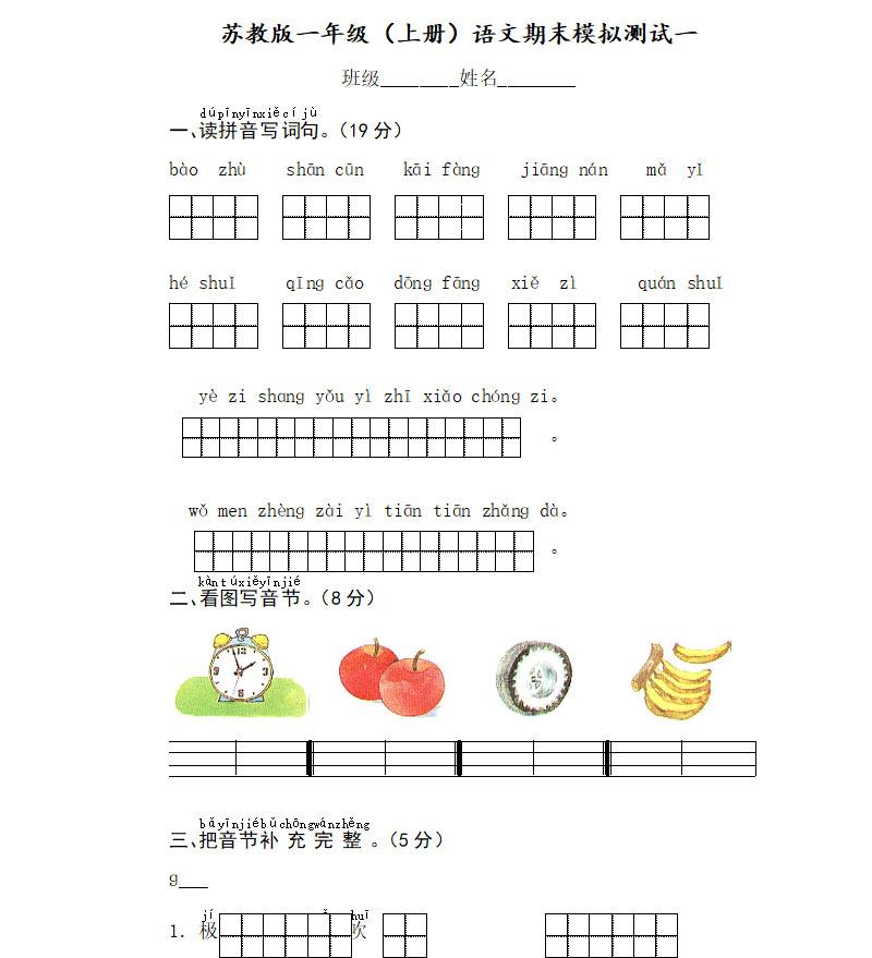 **一年级上册语文期末模拟题,word格式,共2页,可打印下载**