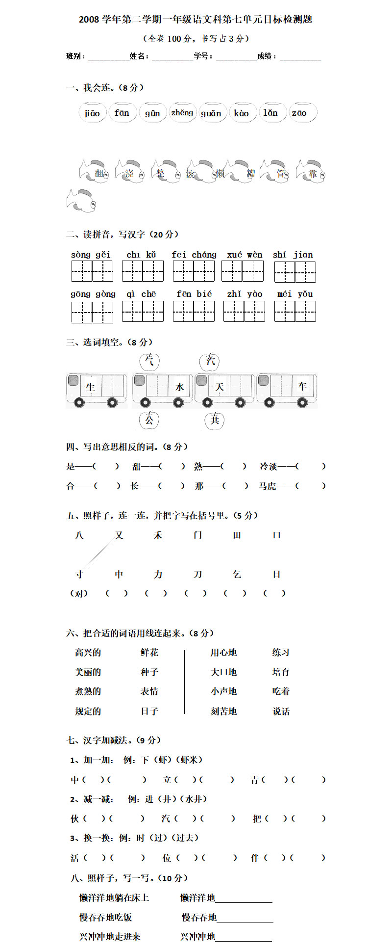 **一年级语文下第七单元检测题,word格式,共4页,可打印下载**