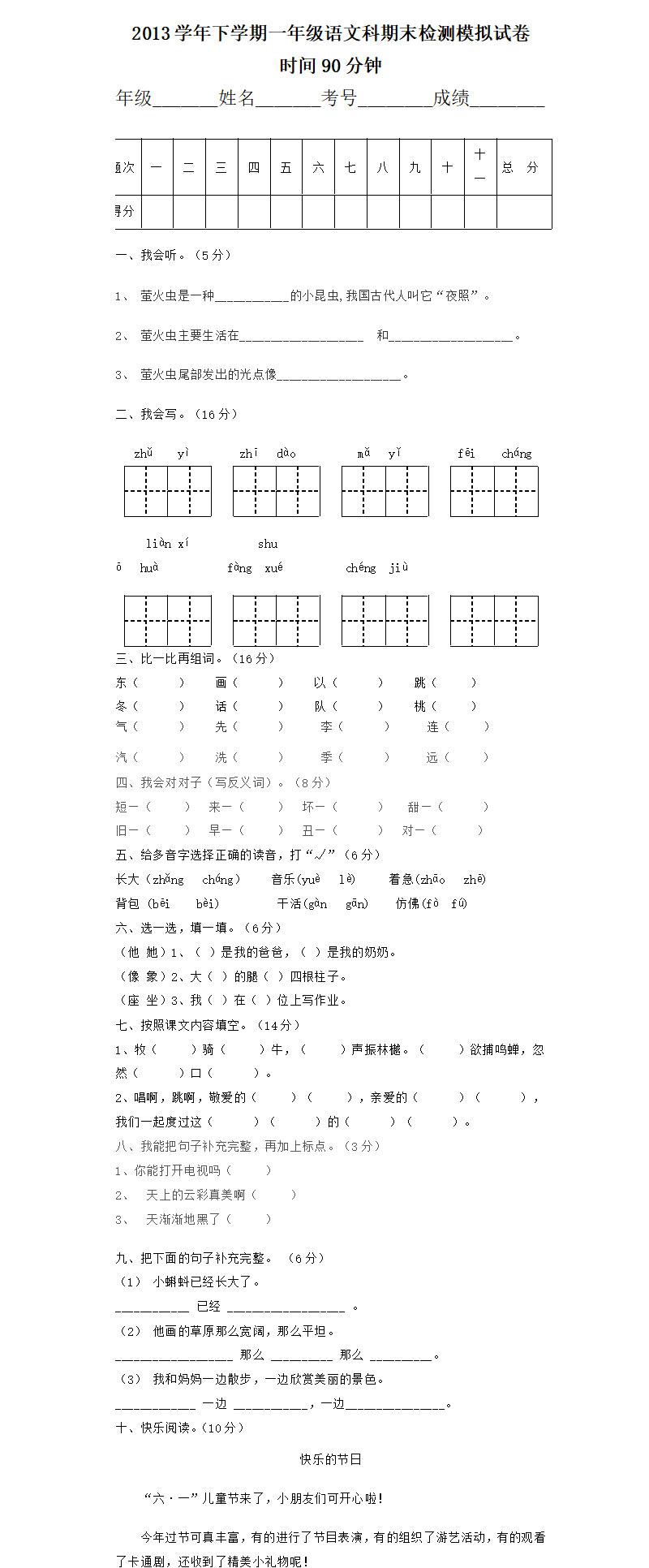 一年级语文下学期期末试卷及答案